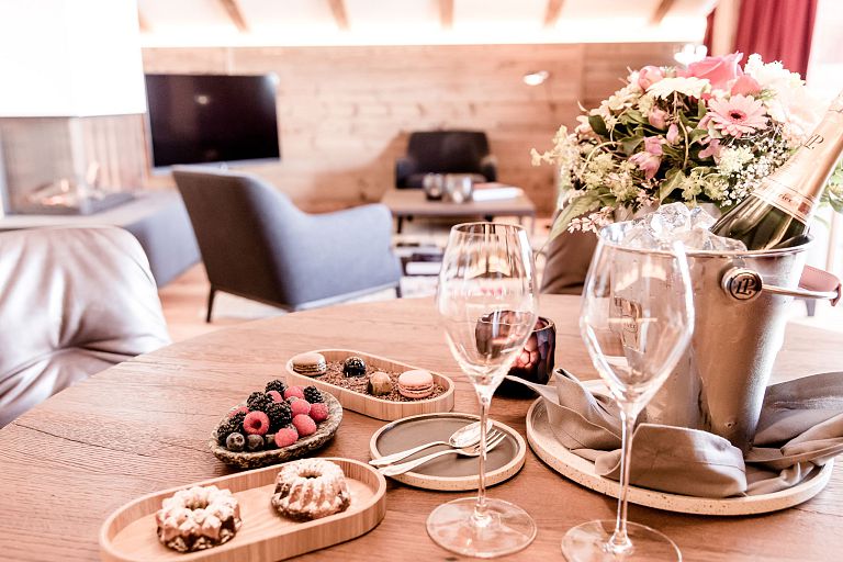 As well as two bedrooms, with their own natural stone bathroom, the suite has other facilities, including a large lounge area with gas-fired stove, cosy sofa nook and Loewe flatscreen TV, along with tea-making facilities and a Nespresso coffee machine. An additional highlight are the floor-to-ceiling window fronts in the lounge area, through which you can enjoy a superb view over the rooftops of Grassau.